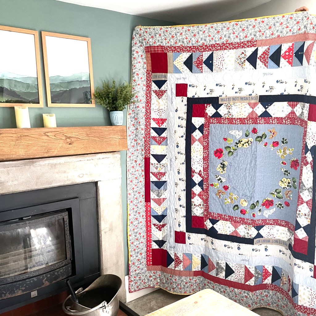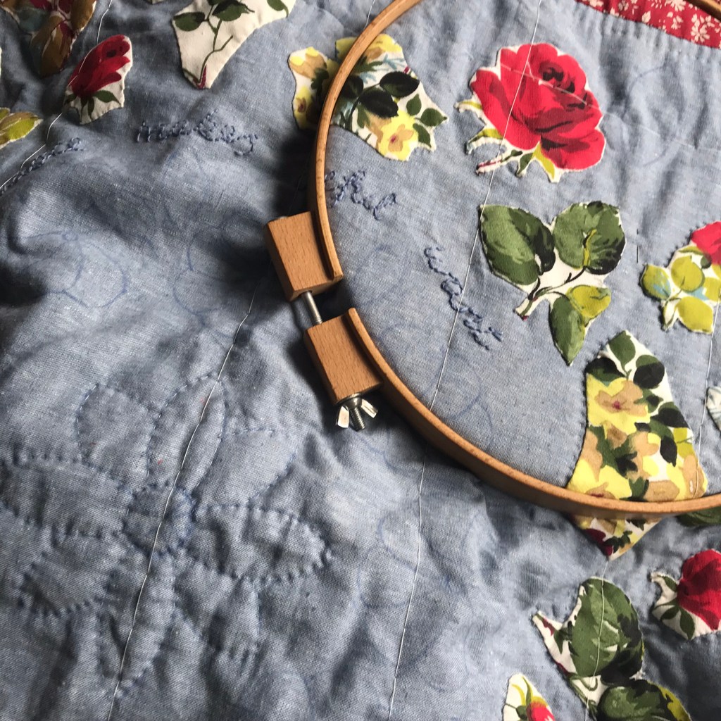 As well as these vintage fabrics I also reused some domestic textiles including a wonderful tea towel with the woven phrase ‘waste not, want not’ made in the UK by the inspiring shop RE in Corbridge. This tea towel became the name of the quilt and also led me to the complete phrase, attributed to the early 1700’s ‘Wilful Waste Makes Woeful Want’ a phrase that I embroidered inside the wreath of broderie perse in the centre medallion. I chose to embroider it in a really subtle blue thread that almost matches the linen background. I wanted this quilt to share its message gently. I wanted it to be first and foremost a beautiful quilt, but with a quiet story about the soul of the quilt with its creative roots in the use and veneration of textiles of the past to remake something a new in the present and for the future. This is as true of the 1800 maker using precious chintz of their Georgian grandmothers as it is of me today using 1950’s barkcloth that reminds me of my Nan’s sunny kitchen.