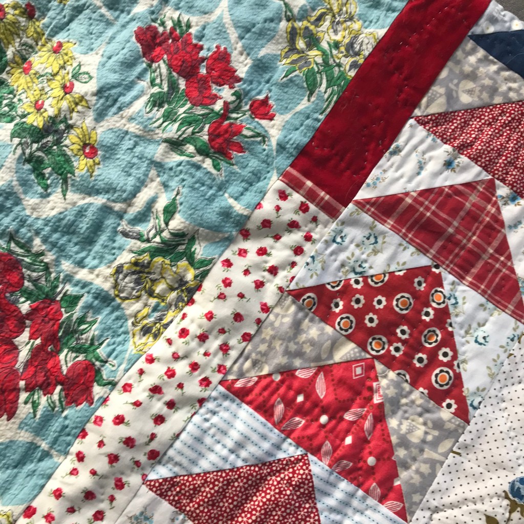 I had bought a small piece of 1950’s Barkcloth called ‘Tralee’ featuring beautiful roses at a second hand textiles fair and so I decided to show it off in a central panel, using a ‘wreath’ shape as my guide to build up the design. I loved the red and blue 1950’s aesthetic of this fabric and so I set to looking out for other vintage fabrics that would complement it. This process of fabric accumulation took longer than usual (although i’m always a long-muller of fabric choices, it usually takes me at least twice as long to put fabric together than to make a the quilt – most of my makes are in a ‘pondering-queue’ of at least a year before the first cut occurs). I really enjoyed the hunt for fabrics. Where as you might usually be able to click on an online shop and put together a fabric pull in an evening, this project required me to seek out suitable fabrics in a range of new places. Charity shops were a great resource for old sheets, ebay and Etsy supplied some pieces and online charity sites such as Oxfam were also a great option. I’ve often incorporated pieces of vintage fabric in my quilts in the past ( my 1718 quilt has a vintage fabric back in soft worn colours that new fabric couldn’t replicate and felt ‘right’ for my quilt in tribute to the oldest of British quilt treasures) and so I had a few great vintage fabric sellers in my IG feed too which was a great way to see and pounce on fabrics that were ‘right’ for this project.