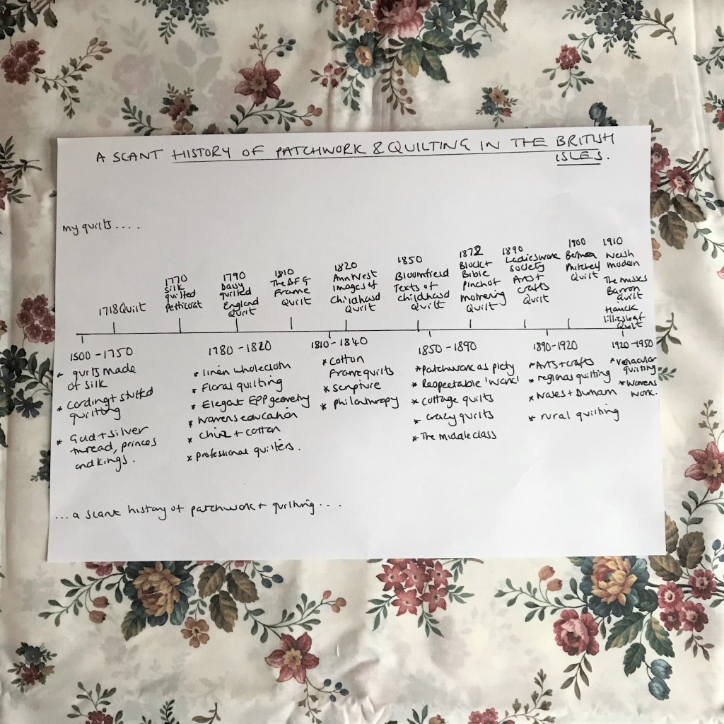 The more I learn as I research the quilts and quilters of the British Isles, the richer that history unveils itself to be. I have been making modern quilts that have their roots in British quilt history. You can read about each make here, but recently I wanted to put this in a timeline, to make it easier to understand how the stories that my quilts reference fit together, how the Scant History of British Quilting and Patchwork fits together into the glorious patchwork of ideas, influences and emotions that is our textile history.