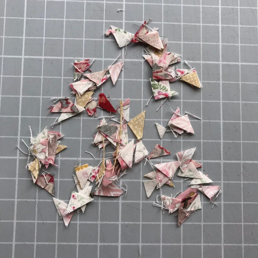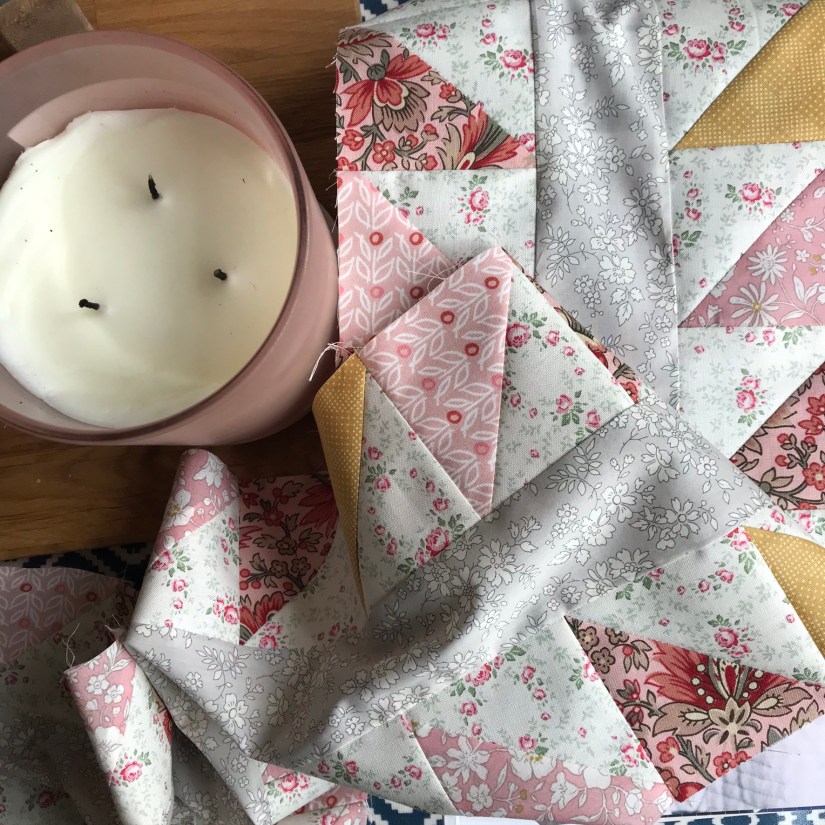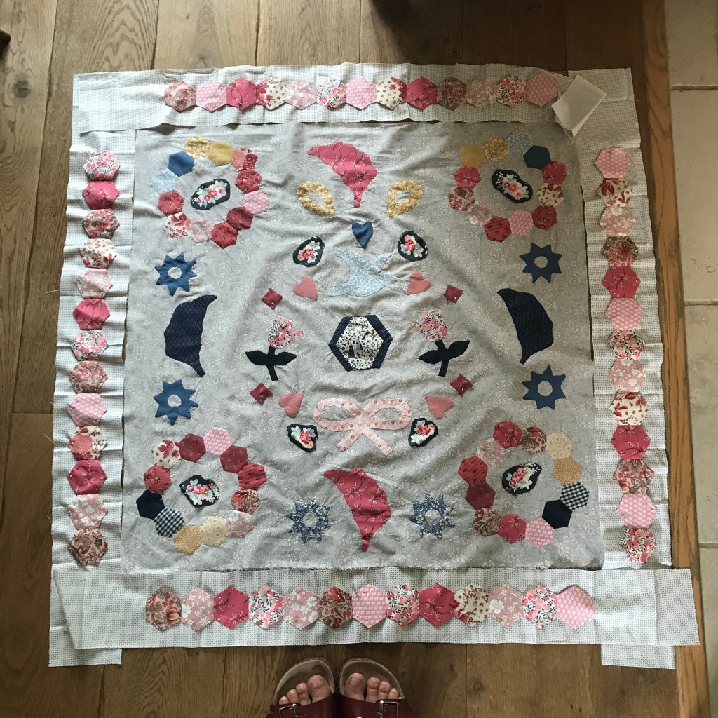 A project which asks us to reflect on needleworkers of the past is right up my street and so I jumped into this one with enthusiasm. In the spring of 2020 as the world shut down and our daily horizons shrunk, I distracted myself by taking a trip through space and time by starting work on a version of a quilt, in The Quilters’ Guild of the British Isles Museum Collection, made in around 1880 by a woman called Agnes Bentham. Every two years the American Quilt Study Group run a challenge exhibition for their members where we are invited to reimagine an historic quilt of our choice to a bi-annual theme. The theme in 2020 was Frame Quilts and I had been researching Agnes and her framed quilt in my academic work, and so I knew that this was the perfect muse for me to take an expansive trip away from the daily dog walk around the same radius of home. The quilt should be 40 inches square so I chose the central medallion piece of her quilt to reimagine today.