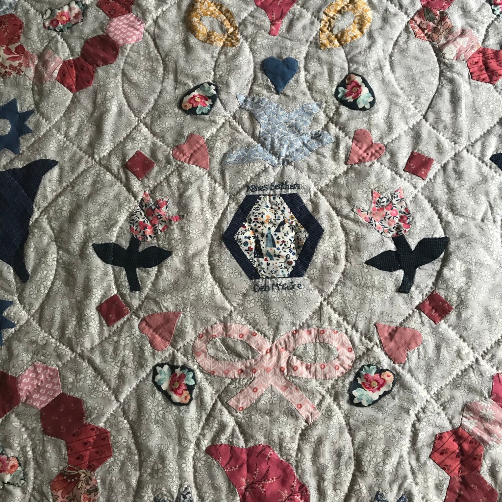 Agnes’s embrace of both the old and the new is also apparent in her treatment of the quilting of this piece. The quilt is all-over quilted lightly using the design subsequently named as ‘bellows’ an intersecting overlapping cable seen commonly on quilts from the northern counties in these decades. The appeal of this pattern was clear, it is easily drafted from a simple single elongated oval shaped template, allowing the pattern to be marked ‘in the frame’. The design sits lightly over pieced and applique quilts, adding texture and strength without interfering with the quilt top’s design. Lastly it is quick and simple to hand quilt in a frame, the pattern is always running towards the stitcher so the skills needed to complete it are less demanding and it can be worked up more quickly. I returned to this pattern for my Remember Me quilt recently.