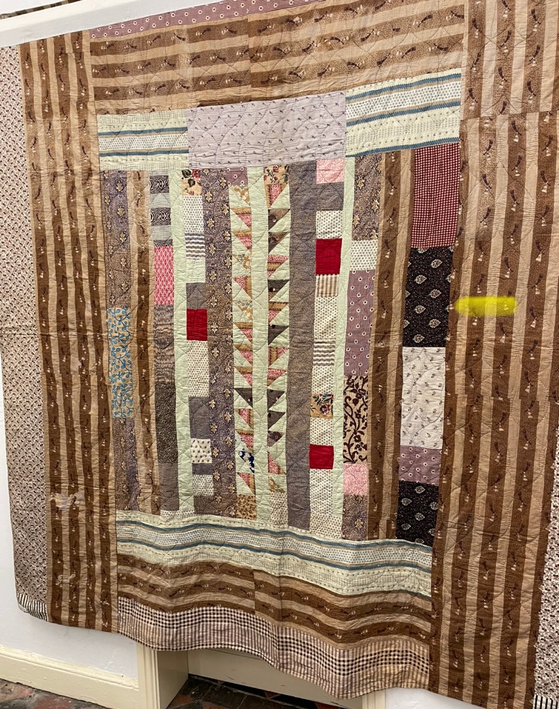 Whilst the front of the quilt is classical in its design, the back is intensely vernacular. The front is clearly for ‘show’ and the back is completely comfortable. In its use of a strippy layout it is reflective of the ‘utility’ quilts of this area, a style which perpetuated into the twentieth century in the northern counties of England. The strippy centre is made bigger through the pragmatic haphazard inclusion of the striped border fabric also visible on the front. Perhaps the strips which make up the centre were created as additional borders to the front of the quilt, or perhaps they indicate that this was not Agnes’s only quilt production?