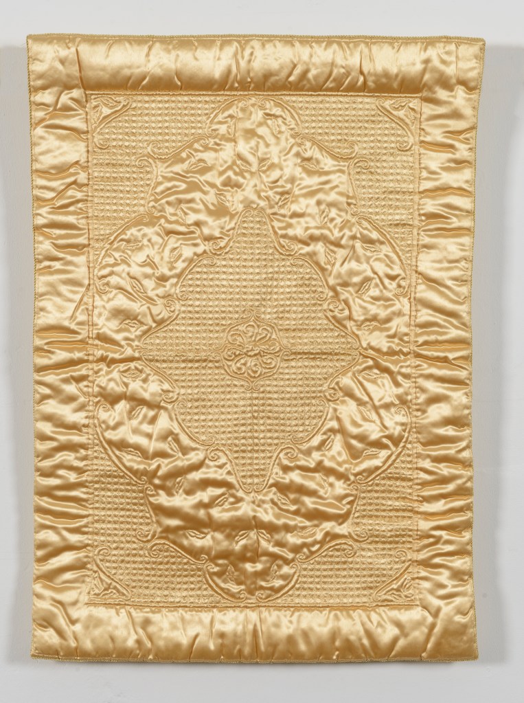 Whilst many of the traditions of quilt making waned in the face of the changes of the twentieth century, the form and style of baby quilts remained influenced by the past. This 1950s sateen rayon wholecloth recalls the silk wholecloth quilts of the eighteenth century. The hexagon patchwork from the 1960s below uses other modern synthetic textiles from 1960s dresses in a similar style to the bright silks and new cotton dyes of the end of the nineteenth century. Whilst we must take care not to equate these similarities to a direct belief that feelings are timeless. The physical process of gestating a baby lent itself to the timely preparation of objects of care in anticipation. Whilst the worlds that each of the babies who slept under these quilts were born into were changed beyond comparison to each other, the fact that someone anticipated these lucky babies arrival, and marked that anticipation in stitch endures for us to explore.