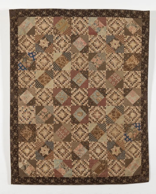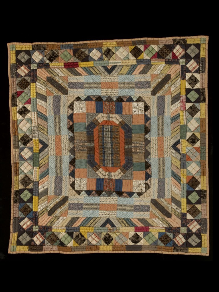 In most families this quilt making was communal. The Cann family, a widowed mother Mary Dennis Cann and her six adult daughters made many quilts in Devon through the 19th century, The Quilt Collection in York now holds several which include two small crib sized quilts made for the only grandchild of this matriarch. These quilts are classic scrap quilts, the fabrics probably reflective of the scraps of an intensely female household making clothes and quilts together. Whilst these quilts are utilitarian, their careful quilting and tiny squares speak also to the attention lavished on this kind of devotional making.