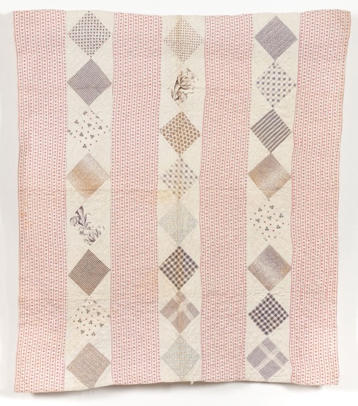 Areas of the UK whose quilting traditions were most protected from the sweeping changes of Victorian Britain kept their cultural heritage alive and vibrant through the making of quilts with regional designs, like this little strippy quilt, most probably made in the upland areas of Northern Britain. Its simple cotton prints and utilitarian strippy design reflected the kinds of quilts most commonly found on beds in working homes in this region at this period. You can read more about the makers of this region in my paper for quilt studies on the Quilt Stampers of Allendale.