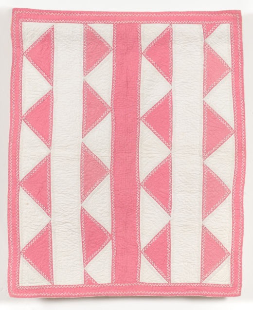 It is sometimes the case that these quilts, made in working homes are dismissed as purely utilitarian. Women using scraps to piece little covers which cost them only time. Yet the small size of baby quilts was so often enhanced with lots of careful stitching like the featherstitch edging of this simple patchwork for a crib from around 1900, that it is impossible not to read care in their making.