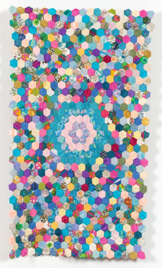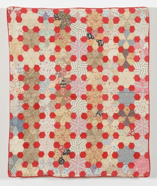 Hexagon patchwork cot top, made from dress fabrics. 1960 – 1969. The Quilt Collection, York.