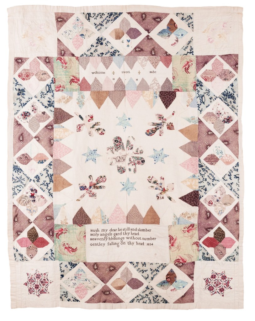 Perhaps the oldest extant baby quilt that we might recognise is this beautiful, early silk patchwork and quilted cover in the V&A, probably made by a member of the Redding family in Kent whose textiles included several quilts and a diary which outlines the ways that matrilineal bonds were reinforced through the making, giving and receiving of textile items like quilts. You can read more about the textiles of this family in the V&A Quilts 1700-1010 book from the 2010 London exhibition.