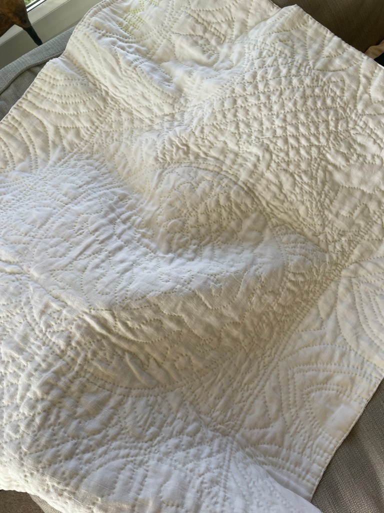 I hope that this little whirlwind post gives you a sense of the long history of this practice. But rather than just looking back I hope that it also encourages modern makers to think about how the past can inform new ideas. In the 1980s Eva Davies stitched this quilted christening dress as a family heirloom, in just the same ways that the babies of the eighteenth century were attired. But instead of a direct copy of the regional styles of the past she stitched her own families history, incorporating welsh quilting designs into the north country ones to make a unique design. Every generation looks back and forges the future. Our rich quilting history in Britain is full of inspiration for modern makers to evolve and shape the future of their making. If you are sewing in anticipation of a baby amongst your friends and family network, know that you form the newest link in an old chain, and do explore this history as you stitch for this new little person whose generation will help shape all our futures.