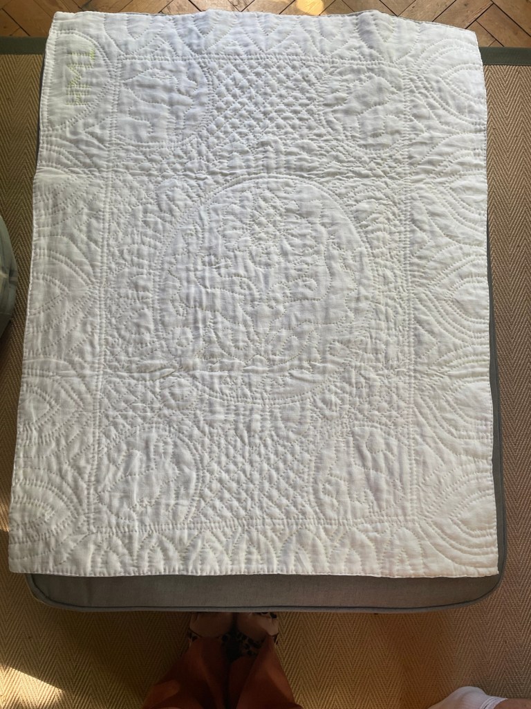 I just finished stitching a little cot quilt for a friend and colleague’s baby. It’s been a few years since I stitched for a baby and the experience had me nostalgic and reflecting. My friend is a historian of eighteenth century relationships, and so I knew straightaway that I wanted this quilt to reference Georgian quilts. Yet at the same time, I needed to make a modern fresh quilt for a new little babe in the world. I’ve enjoyed writing this blog post to share with you all this quilt; but also to share how baby quilts looked in the past and to think about what they meant. It was such a fun brief to sew and write this project up, I’ve loved travelling space and time making it.