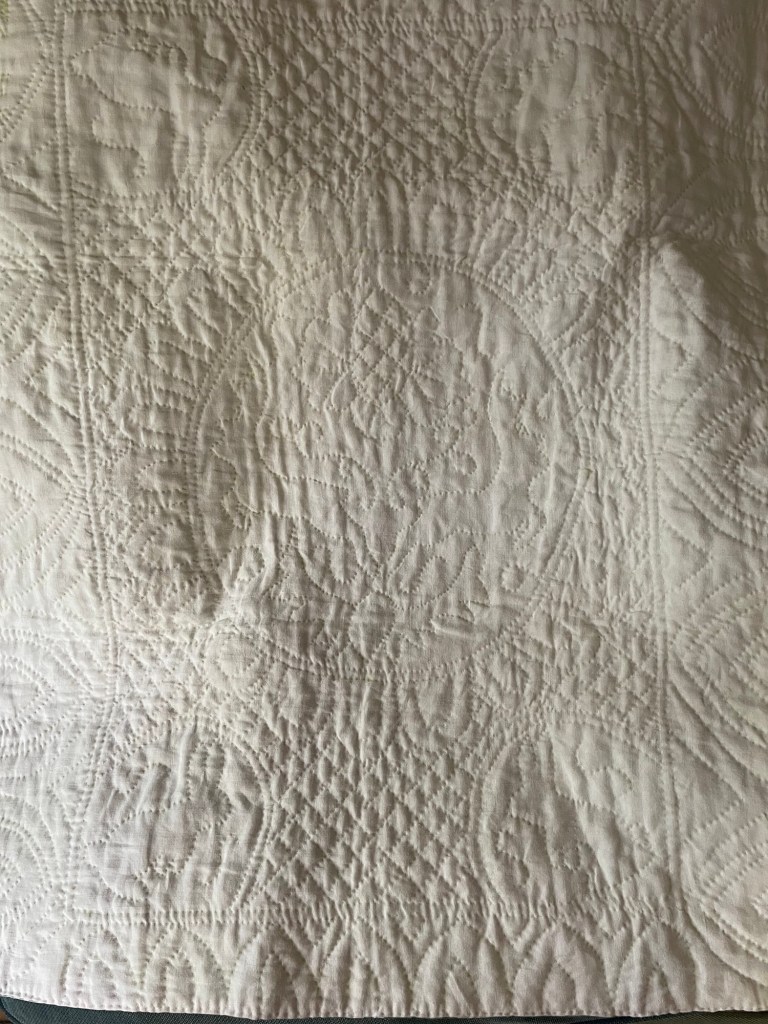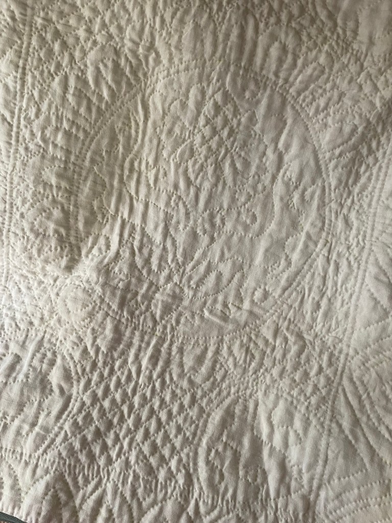 Paintings also reveal to us the role of warm quilted bedcoverings for babies, such as the one by Hogarth below, of baby Hamilton in 1732, which demonstrate the preparations that elite women made in linen for the arrival of a new baby. Women’s letters account for the preparations and the anxiety that surrounded these arrangements. Whilst these quilts are small, typically around 1m x 1.20m, they all show significant amounts of work which would have taken some time to complete, even if a commercial commission. Often the quilt cover was just one part of a set of quilted items including a hood and curtains like in the picture below, or including quilted clothing for child and even a matching jacket or waistcoat (“body”) for the nursing mother. Yet this level of work required some certainty of how much gestational time was available for completion. Of course, in the past in a time before obstetric ultrasound, this certainty could often be elusive. It’s clear that the complexity and care lavished on these little textiles reaches beyond the utilitarian.