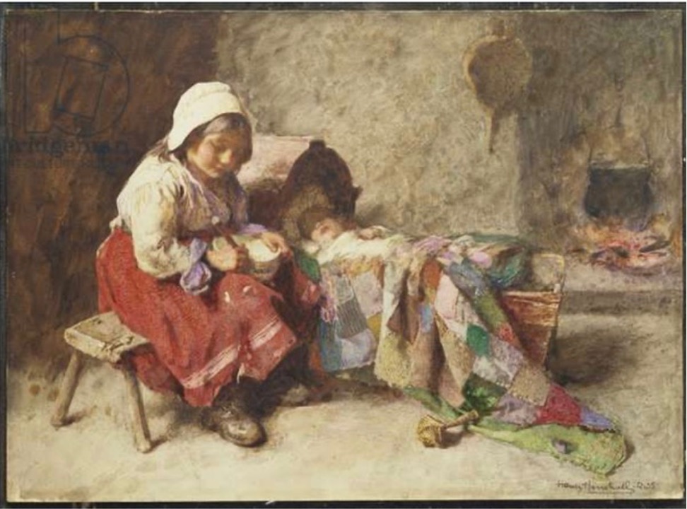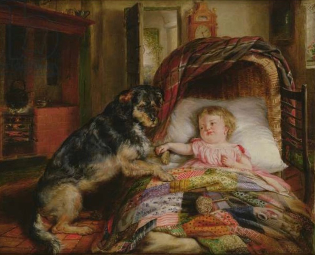 Paintings from the Victorian period also attest to the frequent use of patchwork as an appropriate baby cover. Their association with safety and care are clear in paintings such as this one where dog ( an/or quilt?) guards baby from harm.