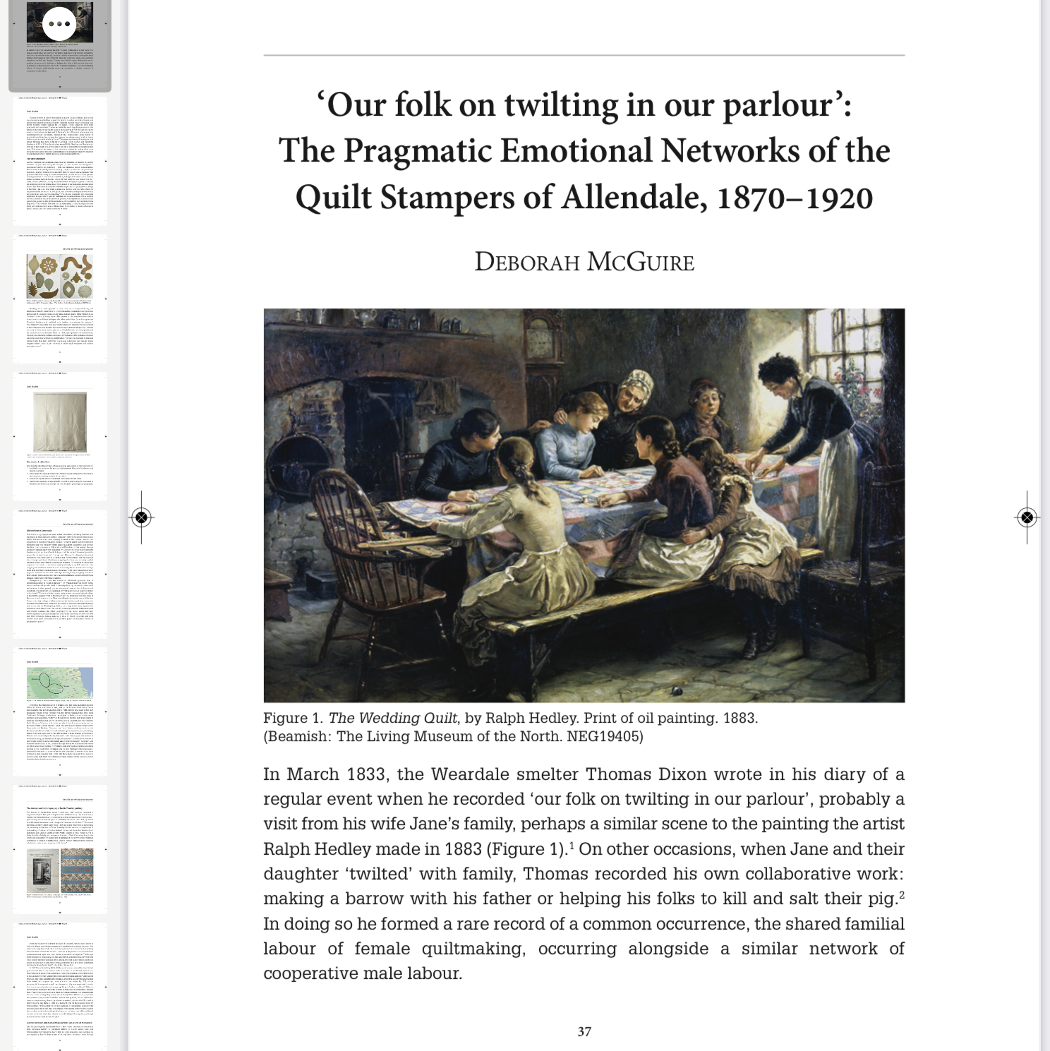 Our folk on twilting in our parlour’: The Pragmatic and Emotional Networks of the Quilt Stampers of Allendale, 1870-1920. Quilt Studies Journal, 24, 37-69. Published June 2023.